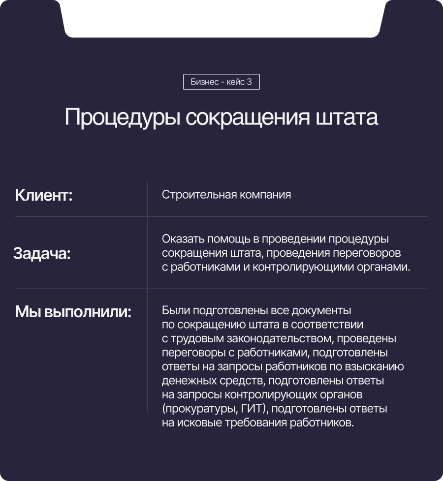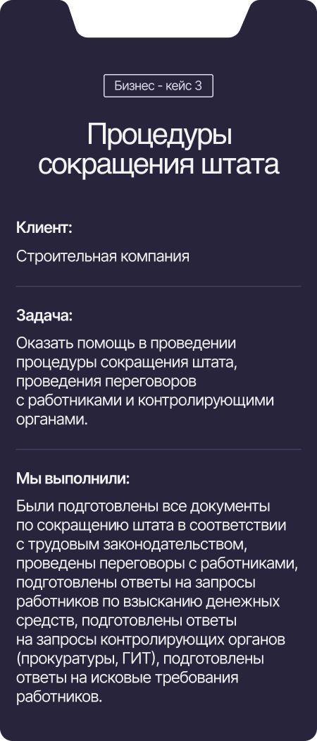 оказание помощи при проведении организацией мероприятий по сокращению штата (работа психолога с руководством и коллективом, подготовка документов в соответствии с трудовым законодательством, ведение переговоров с людьми, подлежащих сокращению, ведение переговоров и переписки с контролирующими органами и судебными инстанциями);