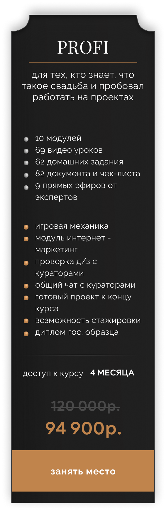 · Программа разработана таким образом, что даже если вы ничего не знаете о свадьбах, вы всё поймете и получите пошаговую инструкцию по работе над проектом.