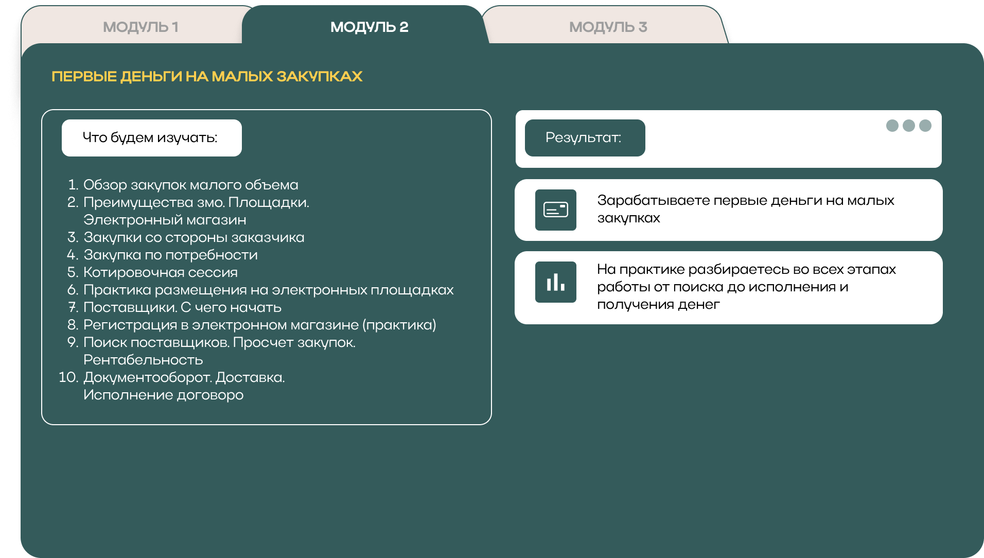 В середине программы вас ждет уникальный челлендж, где вы разделитесь на команды, составите финансовый план, и будете работать как тендерное агенство Вы сразу получите опыт работы с командой и внутри неё, заработаете в такой конфигурации деньги во время практики, накопите огромный багаж знаний.