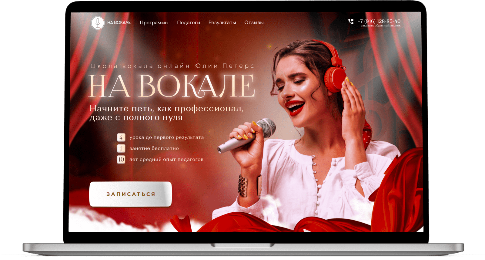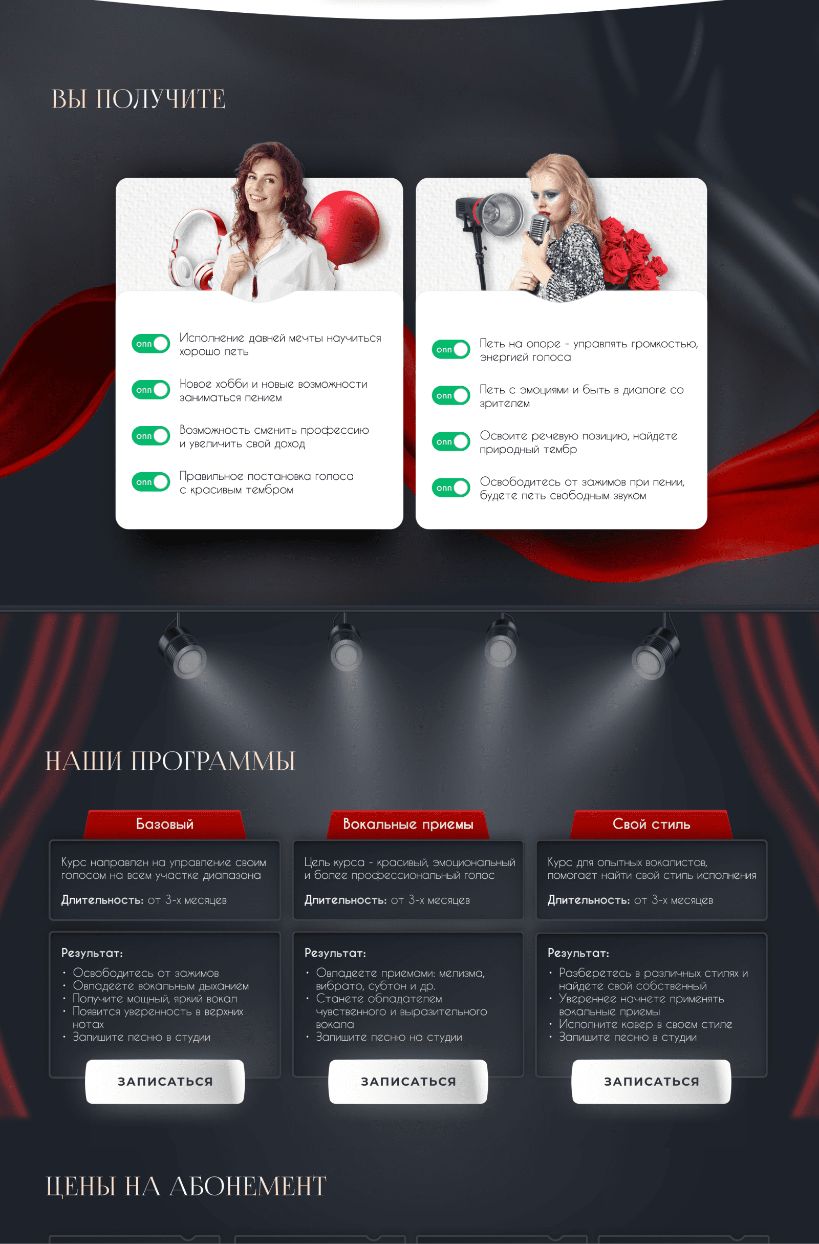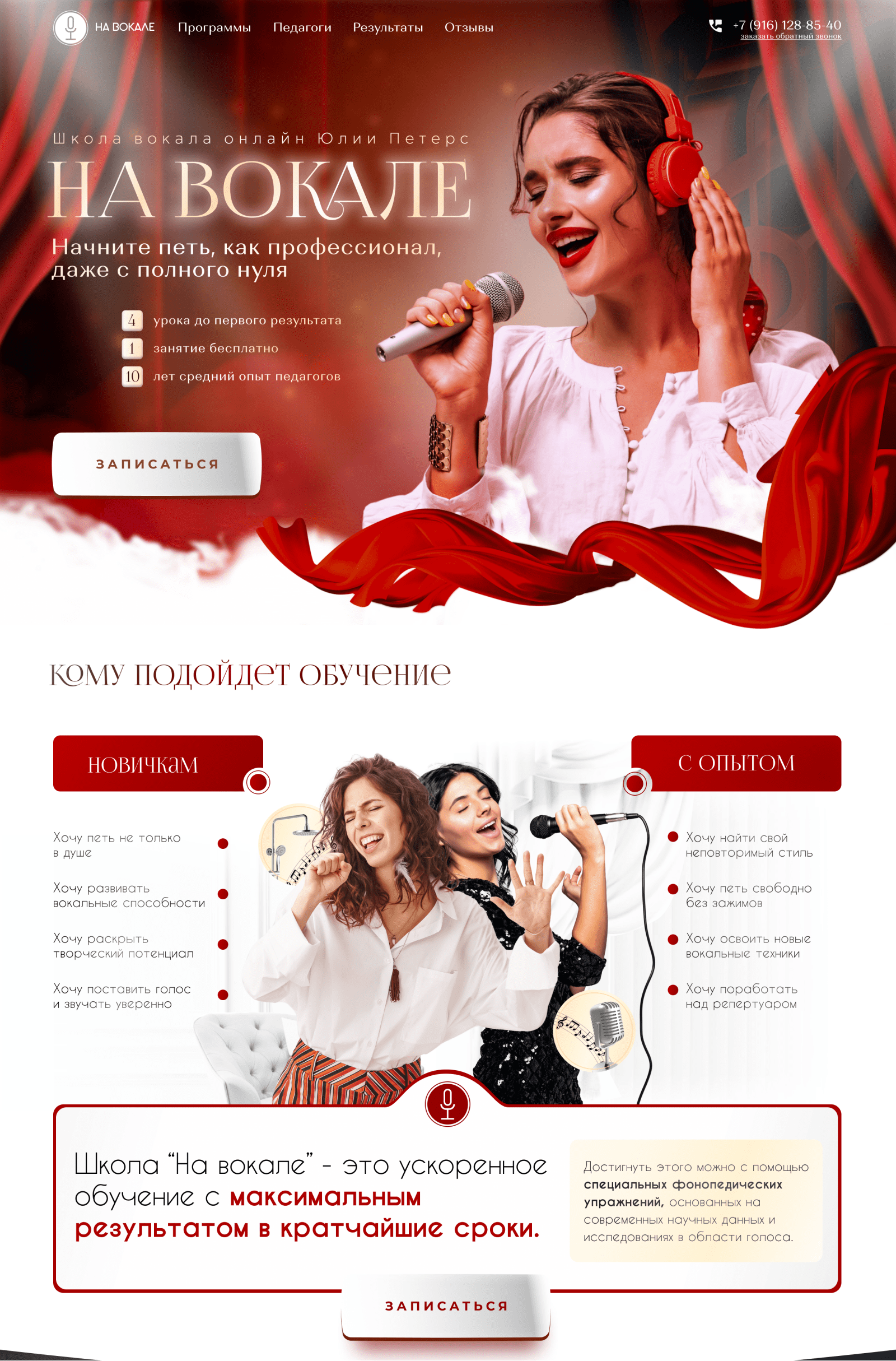 разработать лендинг для онлайн-школы вокала с целью максимизировать покупки обучающих программ школы