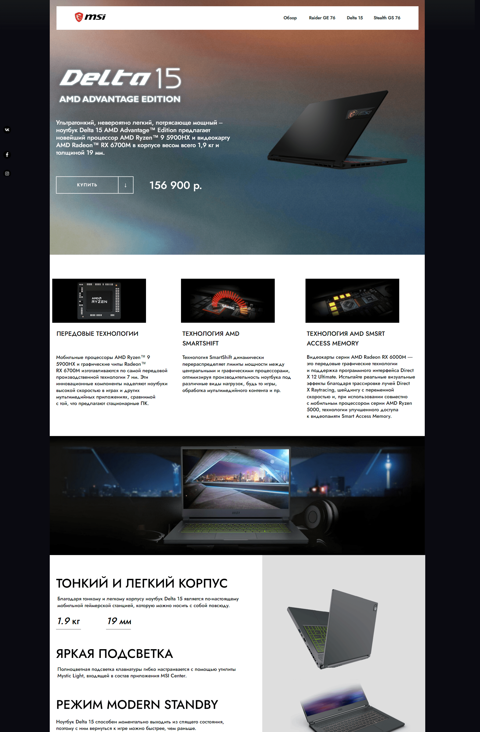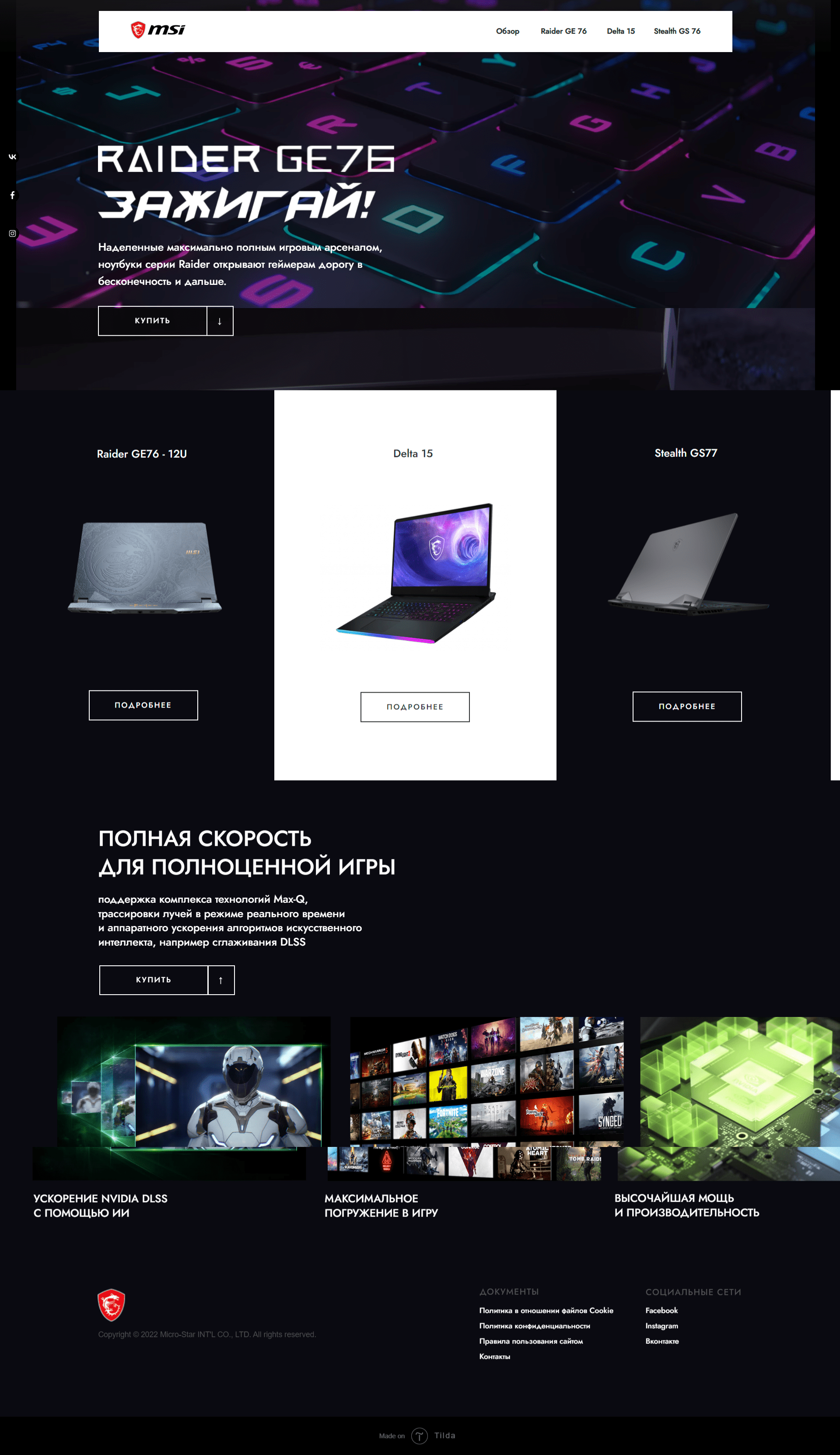 разработать промо-сайт с презентацией основных возможностей 3х линеек игровых ноутбуков